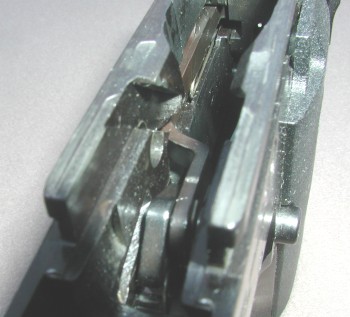 By any standard, the RAP pistols are very well made. All components are made from steel; the frame is an investment casting while the other major components are machined bar stock. The forward portion of the barrel is blued while the chamber area is polished bright. There is no barrel bushing, rather the muzzle is centered in the slide by an integrally machined bulge at the forward edge of the barrel. The external extractor is reminiscent of that on the Browning High Power, pivoted on a roll pin positioned vertically in the slide. Like the High Power, the RAP 440 dispenses with a swinging link to unlock the barrel and slide in favor of a cam system. However, the RAP cam system is more advanced than that of the high power, relying on milled recesses in the barrel underlug and mating recesses in the frame to move the barrel in and out of battery.